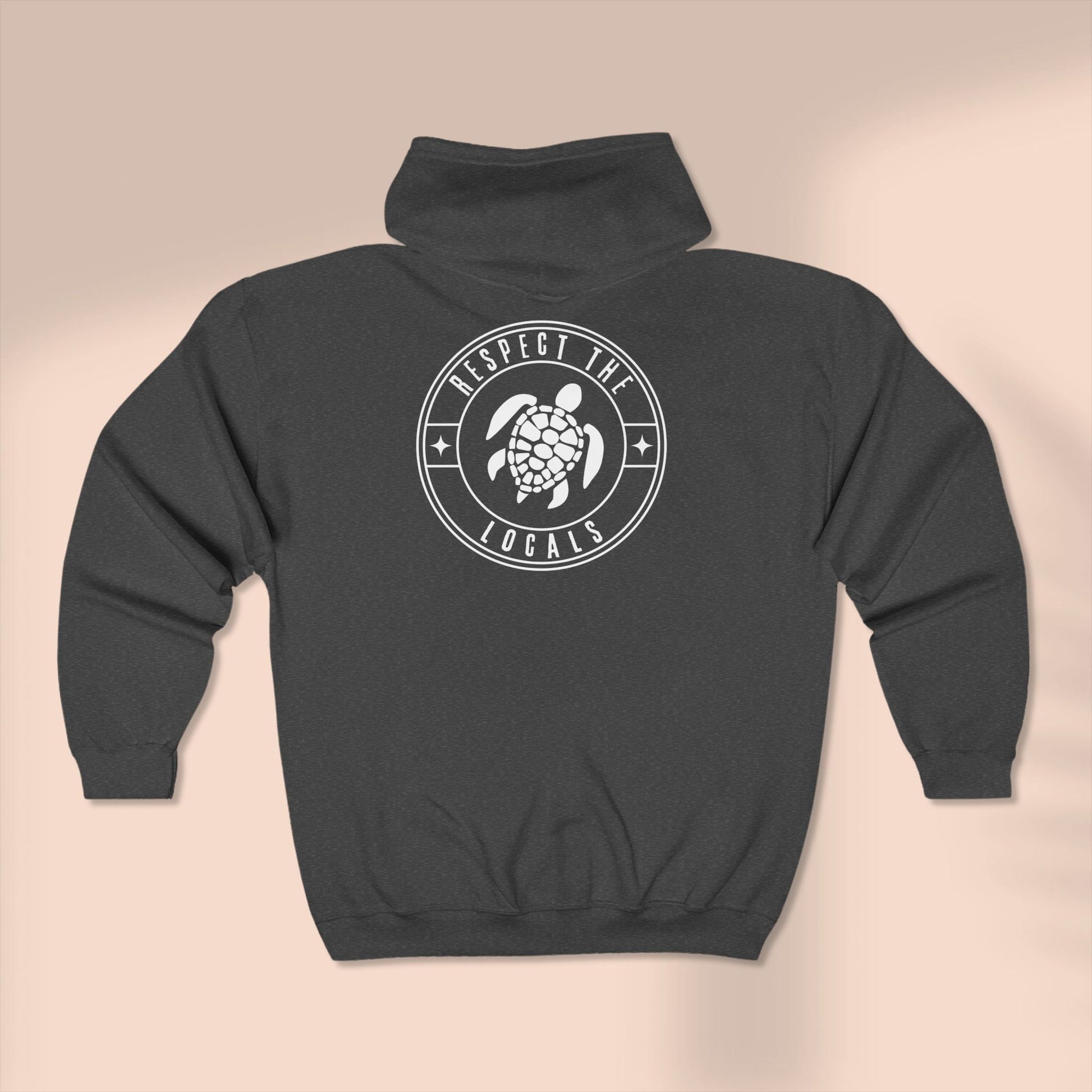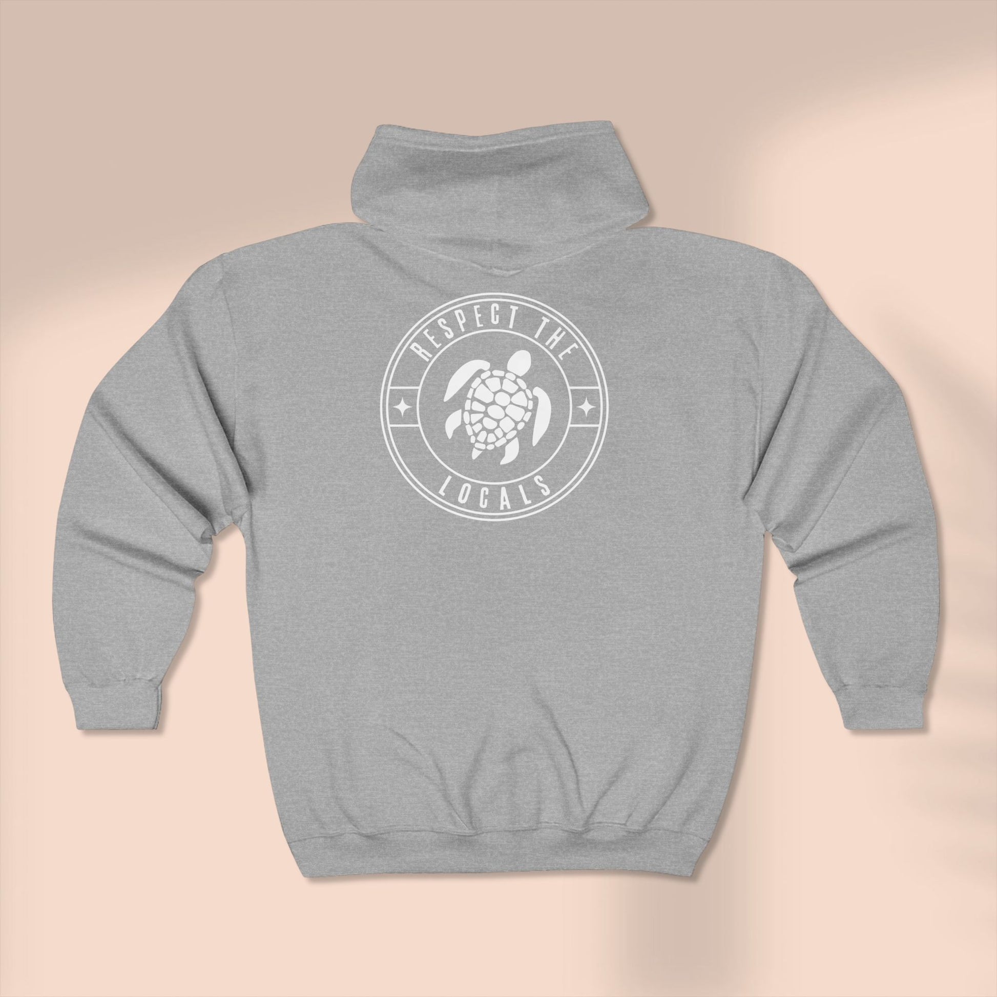 This Turtle watercolor Full Zip Hoodie, with "RESPECT THE LOCALS" on the back exudes a relaxed and artistic vibe, perfect for nature lovers and art enthusiasts. It is a cozy addition to anyone's wardrobe, ideal for casual outings or lounging at home. This hoodie is relevant for nature-themed events, art festivals, or as a thoughtful gift for someone who loves turtles.